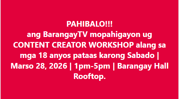 📢 PAHIBALO!!! Ang BarangayTV mopahigayon ug Content Creator Workshop alang sa mga 18 anyos pataas….