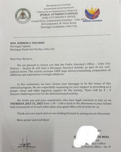 Ang Public Attorney’s Office (PAO) magpahigayon ug FREE Legal Advice/Counselling, Preparation of Affidavits, ug Notarization…