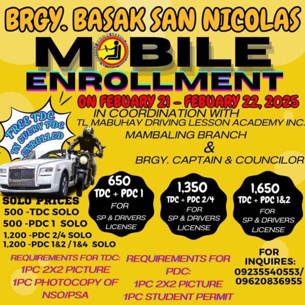 Adunay Mobile Enrollment karong February 21 & 22, 2025 sa Sitio Ubos Poso, Barangay Basak…